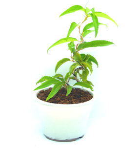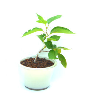 冬は落葉し、春から晩秋まで、四季の風情を感じ取る事が出来る樹木です。一年に2回も、花が咲ます。和風、洋風のお部屋にも調和するカラーの器を使用して、モダンな雰囲気を作り出しています。インテリアとしてお楽しみいただけます。