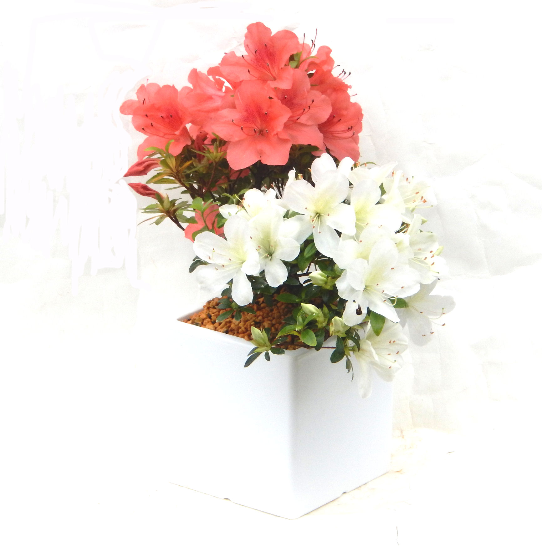 皐月 サツキ 薩摩紅と明鏡との寄せ植え 商品番号:3533:¥4,998 代引きで販売! ギフトの場合は、代引きでなくOK 花は赤と白の花を寄せ植えした紅白仕様 |